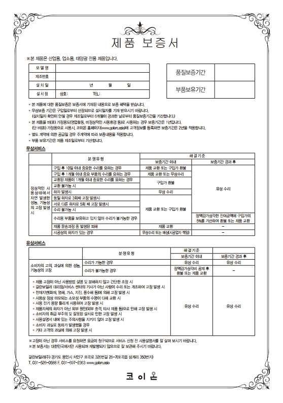 • ½Ã°ø¾÷ü¿¡¼­ ÆÇ¸Å, ¼³Ä¡ÇÑ Á¦Ç°ÀÇ  A/S Ã¥ÀÓÀº ½Ã°ø¾÷ü¿¡ ÀÖ½À´Ï´Ù. Á¦Ç° ±¸¸Å, ¼³Ä¡ ½Ã ÀÌÁ¡ ¿¡ °üÇÏ¿© ¾÷ü¿Í ÃæºÐÈ÷ ÇùÀÇ ÇÏ½Ã¾î ¼³Ä¡ÇϽñ⠹ٶø´Ï´Ù.
